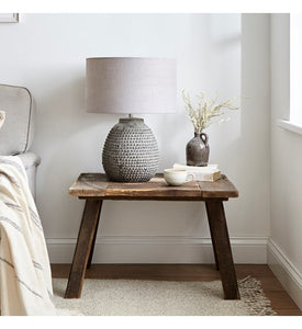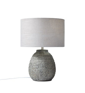 A textured and tactile bobble effect concrete lamp base with matching grey textile lampshade.
